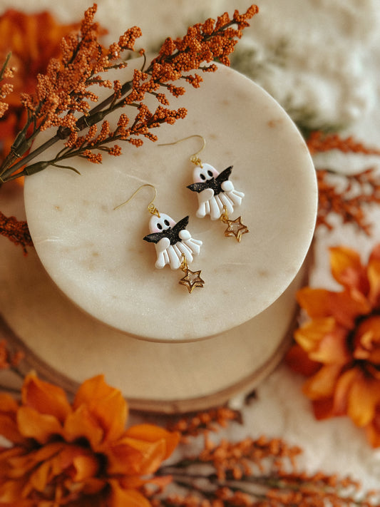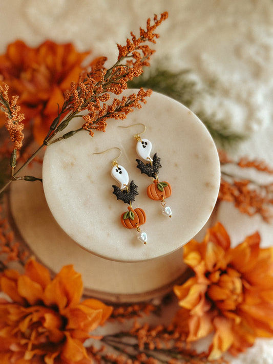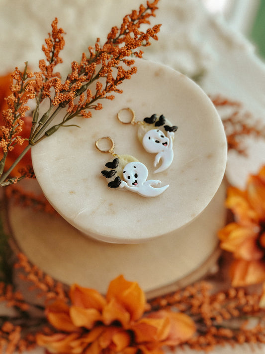 Ghostie & Bat Dangle Earrings – Halloween Ghost & Bat Polymer Clay Drops