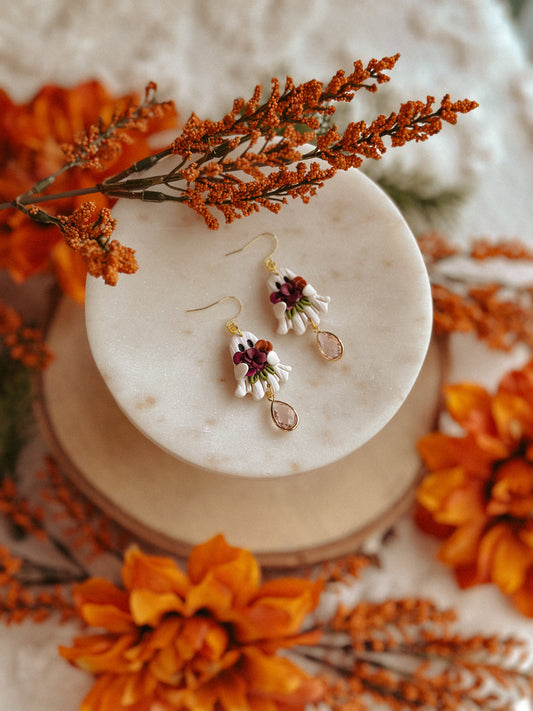 Ghosties Holding Autumn Bouquet Dangles – Halloween Ghost & Floral Polymer Clay Earrings