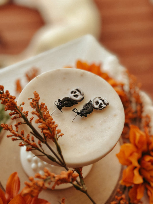 Nevermore Raven Skull Drops – Gothic Raven Skull Edgar Allan Poe Polymer Clay Earrings