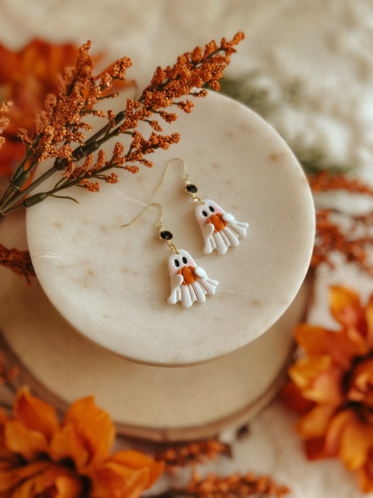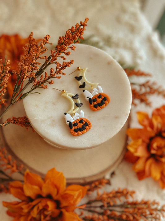 Ghostie Holding Pumpkin Dangle Earrings – Halloween Ghost Pumpkin Polymer Clay Drops