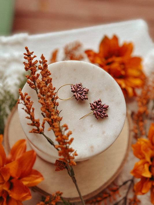 Mulberry Shimmer Maple Leaf Hoop Earrings – Autumn Maple Leaf Polymer Clay Hoops