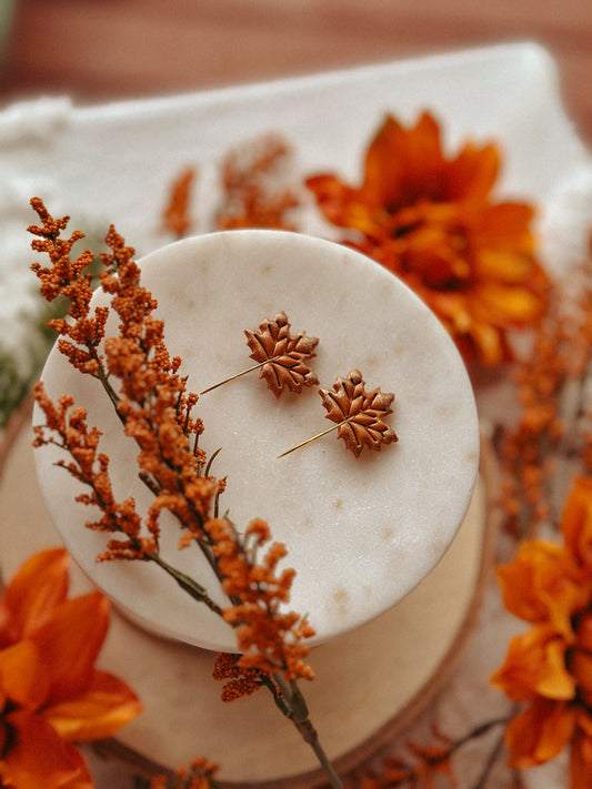 Pumpkin Shimmer Maple Leaf Hoop Earrings – Autumn Maple Leaf Polymer Clay Hoops