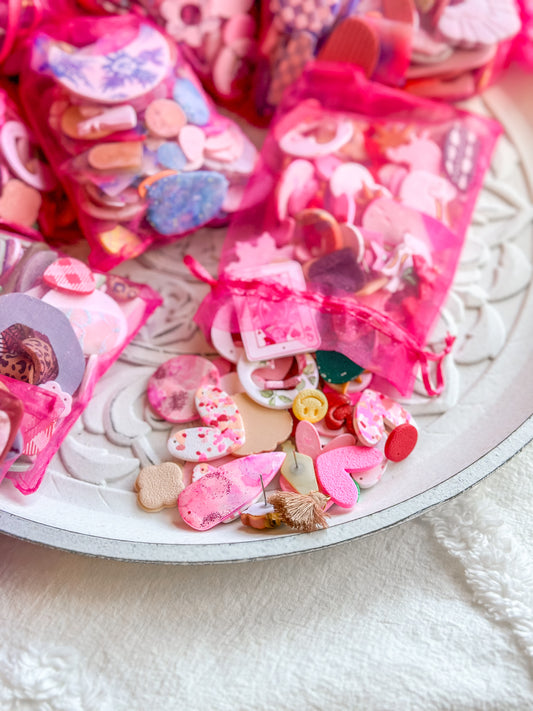 for the makers! overflowing bags filled with fully baked polymer clay pieces, made by yours truly! various themes, shapes, sizes- mixed + random. create your own earrings, jewelry, accessories and all your crafty projects!