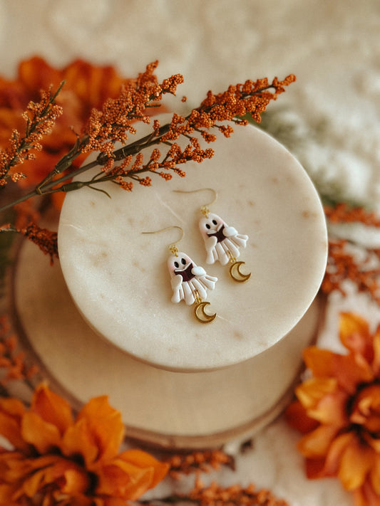 Ghostie Reading a Booooook Dangles – Halloween Ghost Polymer Clay Earrings