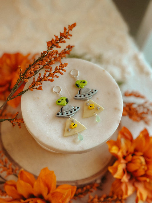 Snoopy Alien Abduction Glow‑in‑the‑Dark Dangle Earrings – Spooky Space Polymer Clay