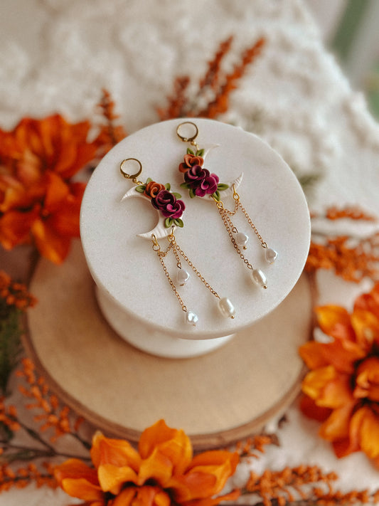 Autumn Floral Crescent Moon Pearl Dangles – Fall Moon & Floral Polymer Clay Earrings