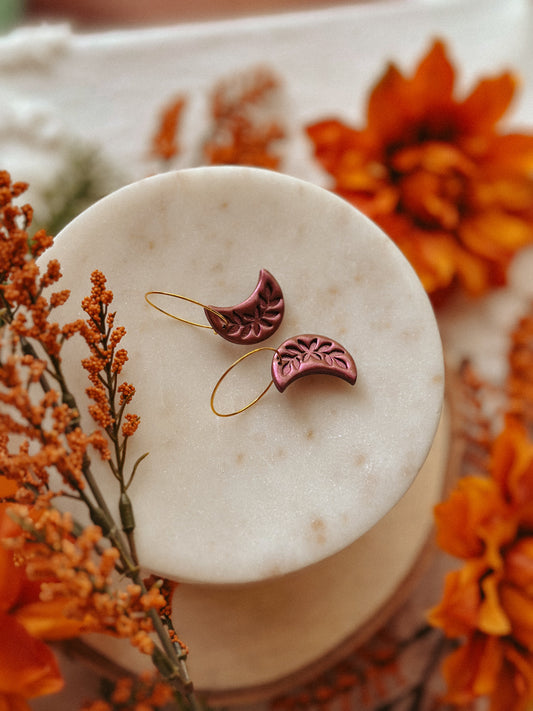 Mulberry Shimmer Crescent Moon Hoops – Shimmery Moon Hoop Earrings in Mulberry