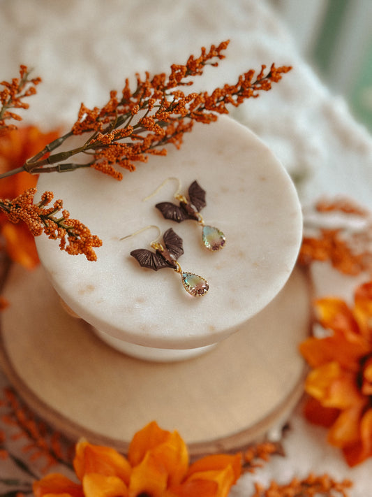 Freakin’ BATS Mocha Gemstone Drops – Spooky Polymer Clay & Gemstone Dangle Earrings