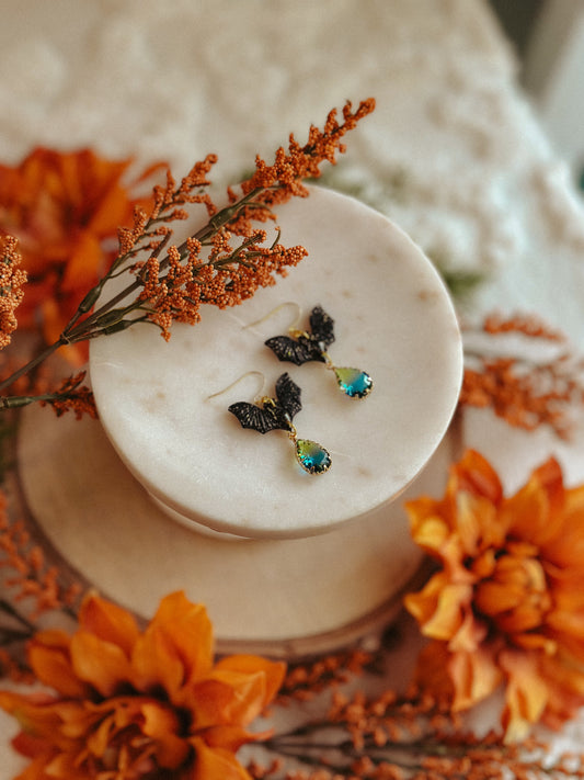 Freakin’ BATS Gemstone Drops – Spooky Polymer Clay & Gemstone Dangle Earrings